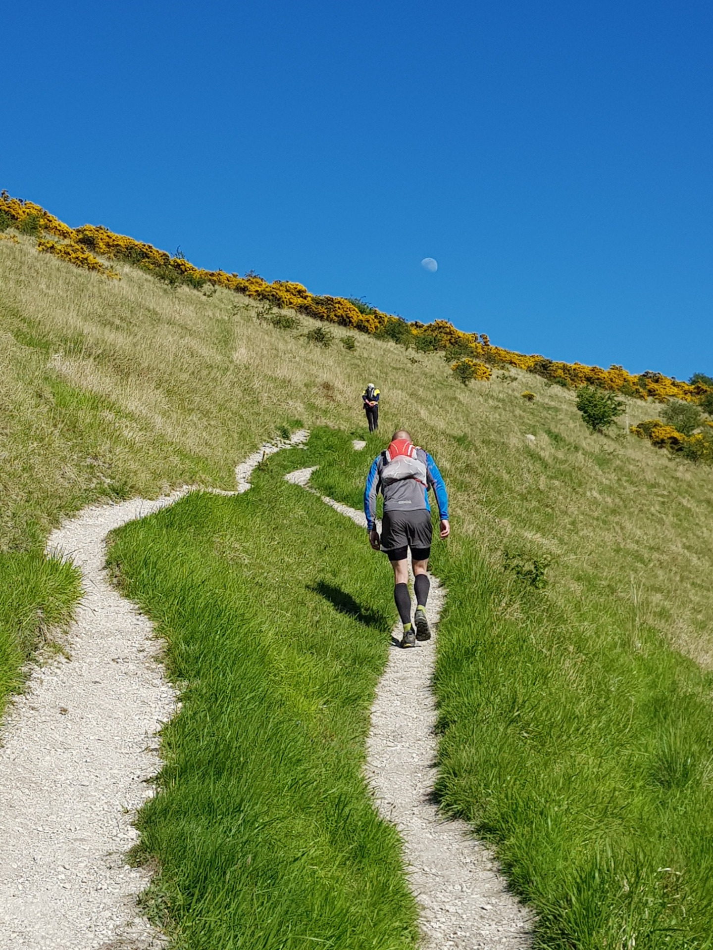 To be honest my memories are a bit sketchy of this first day a lot of the sections blend into one. There's some truly stunning countryside to be seen & on a beautiful day like that day it's amazing but with the tight cut offs ahead of us always in the back of our minds we had to stick to the job in hand & we arrived at checkpoint 4 (40 miles) 3 hours 10 minutes ahead of the 7:00pm cut off, 1 hours 10 minutes up on the plan. That was the kind of safety net we knew would come in handy, we just didn't realise how handy at the time! This was the first indoor checkpoint of the day & time for use of the facilities as I'd failed with a pre race poop without going into detail I was in there a while & felt sorry for whoever followed me. Then off to the crew vehicles for the first hot food of the day a lovely plate of homemade pasta which went down a treat. Upon leaving this checkpoint we were heading into territory David hadn't recced so the navigation was up to me, I felt quite confident of getting us through despite knowing night would be coming soon. We were still going at a good pace even though there were some big climbs again in this section we left our poles & joked about who's stupid idea that was half way up one of the climbs where the moon sat at the top of the hill in the clear blue sky.